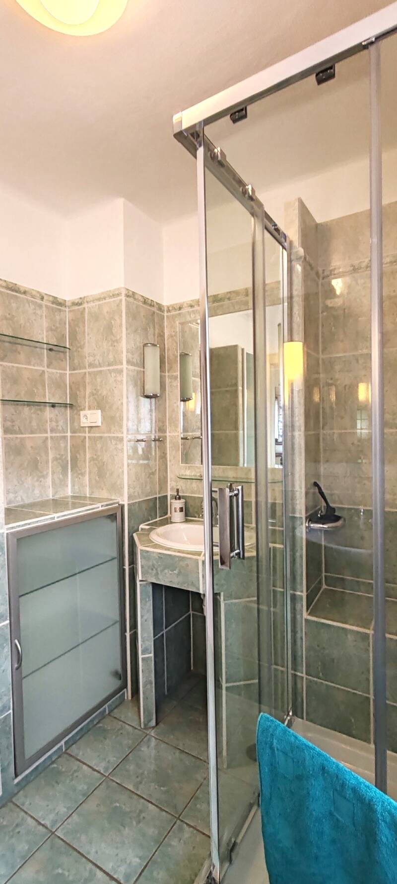 Experience a luxuriously appointed bathroom designed for exceptional comfort. The contemporary shower installation and dual basin arrangement facilitate convenient simultaneous use. A complimentary hairdryer enhances your grooming experience and streamlines your daily regimen. For optimal privacy and convenience, the lavatory is discreetly positioned in a separate, self-contained compartment.
